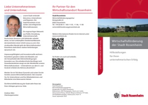 Herausgeber: Stadt Rosenheim Wirtschaftsförderungsagentur Königstraße 24 | 83022 Rosenheim Bildnachweis: MH Photography; iStock.com: lushik, denny Fachrul Rozzy, Ankudi, Mexpara Salimova, FG Trade, ArtistGNDphotography, industryview; Team 13 Stand: September 2023 Wirtschaftsförderung der Stadt Rosenheim Hilfestellungen für Ihren unternehmerischen Erfolg UNTERNEHMERSERVICE Liebe Unternehmerinnen und Unternehmer, unsere Stadt verbindet Menschen, Unternehmen und Regionen. Die Stadt Rosenheim ist ein starker und erfolgreicher Wirtschaftsstandort. Ein engmaschiges Netzwerk aus Politik, Verwaltung, Unternehmerschaft, Hochschule, Kammern und Verbänden arbeitet daran, im hart umkämpften Standortwettbewerb den berühmten einen Schritt voraus zu sein. Den strukturellen Wandel geht der Wirtschaftsstandort Rosenheim dank dieser starken Verbindungen dynamisch mit. Anpassungsfähigkeit und Innovationswille zeichnen Rosenheim gerade in Zeiten des Wandels und der herausfordernden Rahmenbedingungen besonders aus. Die anhaltend hohe Nachfrage nach Gewerbestandorten zeugt von der Attraktivität unseres Wirtschaftsstandorts – Unternehmen aus dem In- und Ausland schätzen die Adresse„Rosenheim“. Werden Sie ein Teil dieser Dynamik und nutzen Sie die Vorteile unseres Wirtschaftsstandorts: Hier erwartet Sie, Ihr Unternehmen und Ihre Mitarbeiterinnen und Mitarbeiter eine lebenswerte Heimat. Die Wirtschaftsförderung der Stadt steht Ihnen bei Ihren Anliegen gerne zur Seite. Andreas März Oberbürgermeister Ihr Partner für den Wirtschaftsstandort Rosenheim Stadt Rosenheim Wirtschaftsförderungsagentur Königstraße 24 83022 Rosenheim Tel. +49 (0) 80 31 / 365-11 05, -11 06, -11 08 wirtschaftsfoerderung@rosenheim.de Weitere Informationen finden Sie im Internet unter www.rosenheim.de. Sie finden uns auch auf Linkedin.